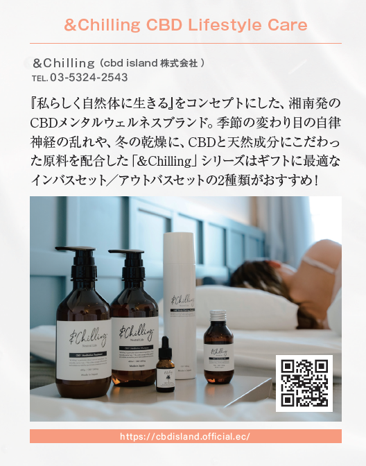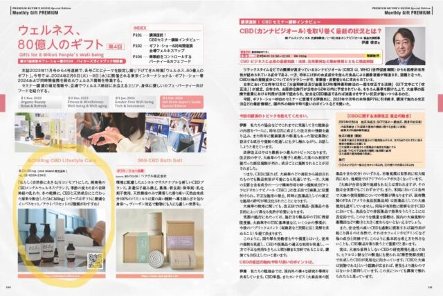 弊社製品が掲載されている第4回目は、2024年2月6日(火)~ 8日(木)に開催される東京インターナショナル ギフト・ショー 春 2024および同時開催展を絡めたウェルネス情報が特集されており、㈱アムズメディカル 代表取締役/(一社)日本カンナビジオール 協会代表理事の伊藤 俊彦氏によるインタビュー「CBD(カンナビジオール)を取り巻く最新の状況」なども掲載されております。