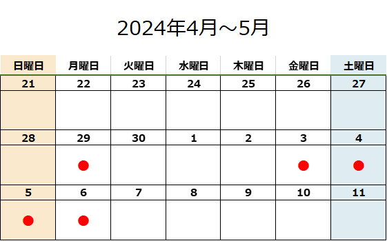 ■GW休業期間:2024年4月29日(月)、2024年5月3日(金)~5月6日(月)