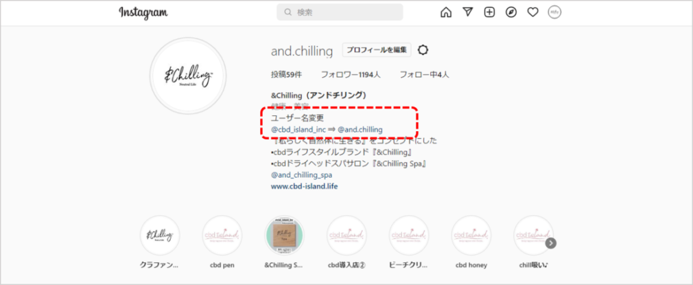 いつもcbd island株式会社をご愛顧いただき誠にありがとうございます。 昨日3月14日(月)より、cbd island株式会社の公式instagramアカウント『@cbd_island_inc』が、 新ブランドである『&Chilling(アンドチリング)』へ変更となりました。 新しいアカウント名は『@and.chilling』となります。 アカウント名変更の影響で当社パッケージやリーフレット等に記載されている 公式instagramのQRを読み込むとアカウントが存在しない旨の表示がされます。 皆様には大変ご迷惑をお掛けしますが、公式instagramを見ていただく際には 『@and.chilling』で検索を頂くか、公式WEBから『@and.chilling』への リンクをクリックしていただけると幸いです。 順次、パッケージやリーフレット等は、新しいQRコードへ 変更をかけていく予定ではありますがご了承いただければと思います。