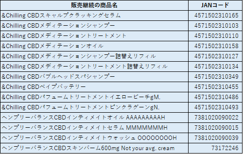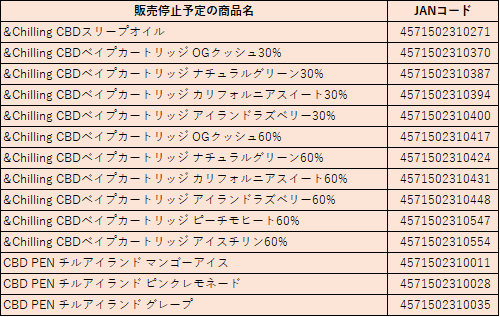 この度、2024年12月12日より施行される「大麻取締法及び麻薬及び向精神薬取締法の一部を改正する法律」に基づき、弊社製品の一部に含まれるTHC残留量比率が新基準に抵触する恐れがあるため、以下の商品につきましては2024年12月12日以降、使用ができなくなりますことをお知らせいたします。